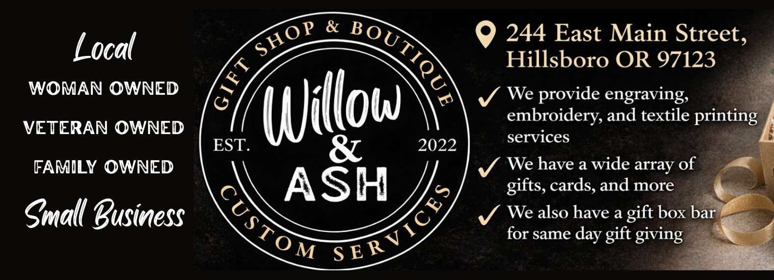 Willow & Ash is a unique gift shop and mini boutique. We specialize in fun, snarky and "different" type of products that can appeal to everyone and at every price range. We also sell many Made in Oregon and Made in the PNW lines, as well as local to Beaverton, Forest Grove, and Portland areas as well. We recently brought forth the ability to customize products, and do printing, embroidery and engraving services. If you can think about it, we can create or customize it. We have even created products from scratch for clients as well (we recently built pennants for Adelante Mujeras here in Forest Grove...and created military ornaments for a client this Christmas (2024)!)