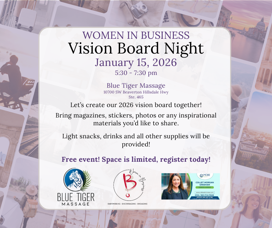 Presented by Blue Tiger Massage and Collet Sells Homes. Space is limited — come ready to envision, connect, and be inspired!